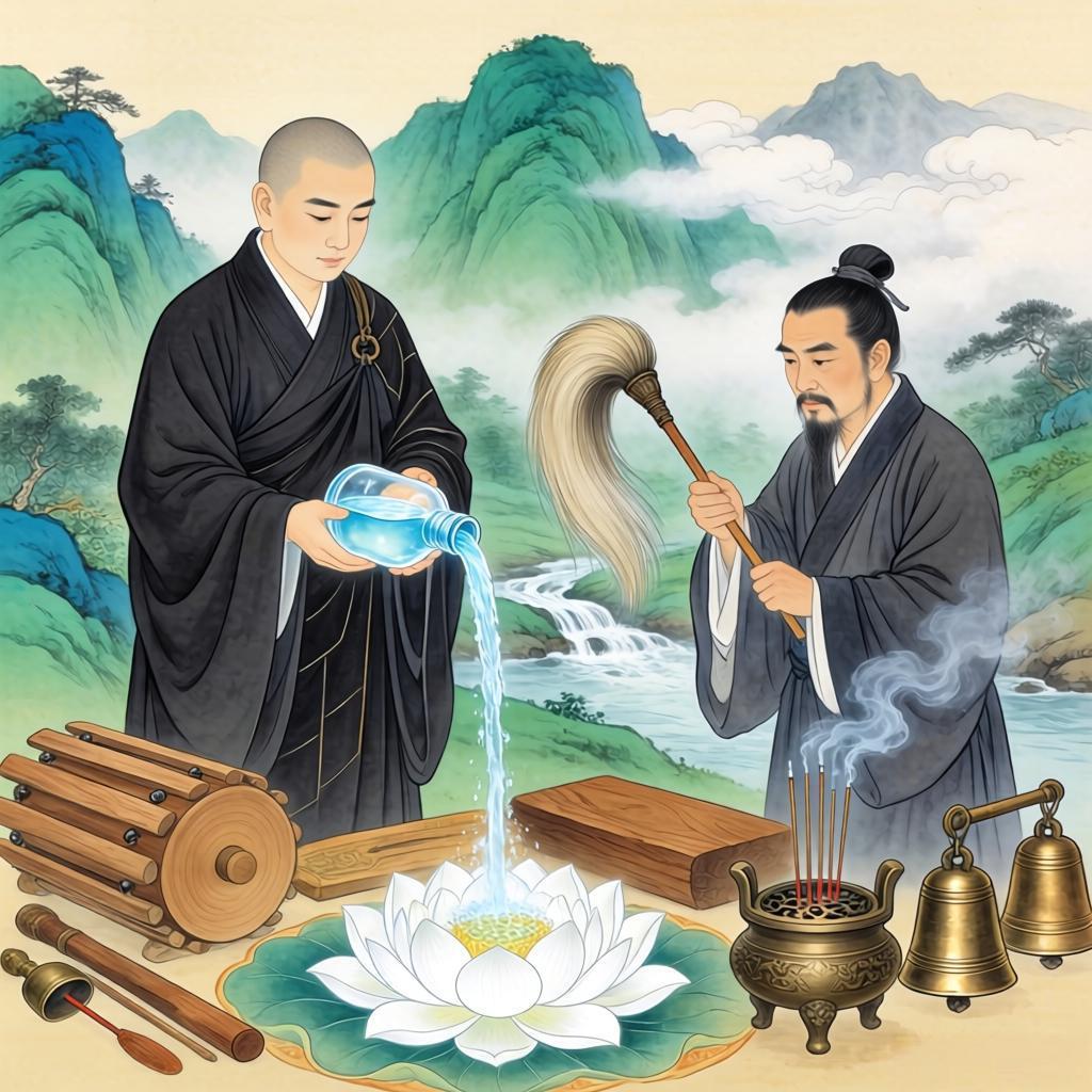在中国民间,尤其是地方性仪式中,常出现“佛道混杂”的洒净,例如道士用大悲咒水,或僧人以道教符箓形式洒净。这属于民俗层面的实用主义融合,而非教理层面的同源。